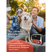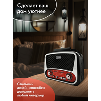 Радиоприемник MIRU SR-1019 имеет ретро дизайн и выполнен в черно-серебристом корпусе с красными вставками и представляет собой простое устройство для воспроизведения потокового радио вещания. Модель предусматривает всего один динамик, но этого вполне достаточно, чтобы вы получили насыщенный звук. Радиоприемник улавливает радио каналы в диапазоне FM, АМ и SW, гарантируя отличную связь благодаря встроенной телескопической антенне, которая способствует улучшению сигнала. MIRU SR-1019 имеет линейный аудио вход и поддержку чтения microSD карт, а наличие фонарика на боковой панели, будет отличным дополнением. Благодаря тому что, радиоприёмник работает не только от сети 220 В, но и от аккумулятора или батареек, он является мобильным устройством. Вы сможете взять его на пикник и наслаждаться трансляцией любимой радио передачи в компании с веселыми ведущими. Для управления устройства предусмотрены механические переключатели.